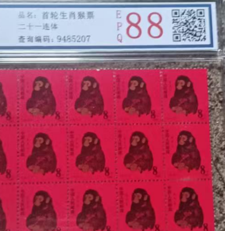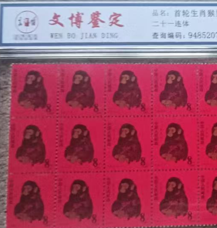 首轮生肖猴票二十一连体是新中国生肖邮票的开山之作,由艺术大师黄永玉设计,原票本身就因雕刻精美、存世量少成为“邮市风向标”;二十一连体属整版未裁切原始版式,完整保留印刷工艺细节与版式原貌,比单枚或小连张更具稀缺性,兼具邮票本身的历史纪念意义、艺术价值与版式收藏的独特性,是邮藏领域中“龙头题材+稀缺版式”的双重核心藏品,保值增值属性突出。