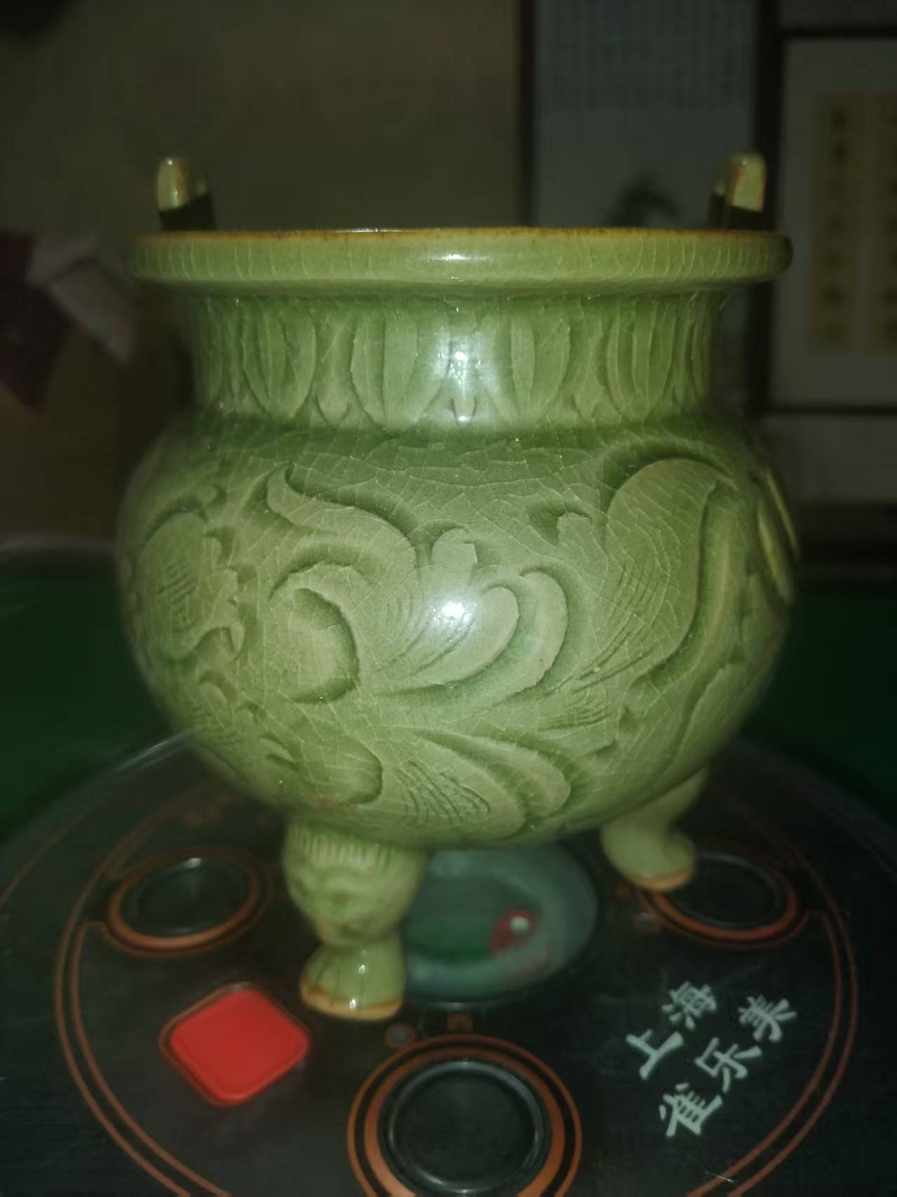 宋龙泉窑青釉双耳三足香炉